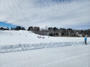 Yesterday, five youth from All Saints’ drove up to Rawdon to go tobogganing on the spectacular snow pile that’s built on their public beach in winter, and skating on the track that’s made out on the lake. We met up with 20-odd kids from Christ Church and spent a happy couple of hours flinging ourselves down the steep slope and sliding out onto the ice. I only made two trips down the sledding hill, one on an inner tube by myself and one on an old-fashioned wooden toboggan along with Rodney Clark, the priest at Christ Church.