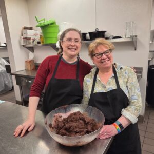 Me and Kristy Barnes of Hennepin Avenue United Methodist Church, Minneapolis, in the church kitchen making lunches for teachers at a local elementary school targeted by ICE, Wednesday, February 11 (yes, that is several pounds of chocolate buttercream frosting. Sometimes ministry is delicious!)